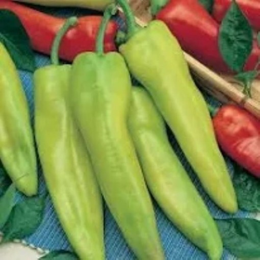 70 days. Capsicum annuum. (F1) Geronimo Pepper. The plant produces high yields of 5 ½" long by 1 ½" wide Banana hot peppers. Peppers are medium hot and turn from light green, to orange, to red when mature. The plant has green stems, green leaves, and white flowers. Excellent for pickling, frying, or stuffing. Suitable for containers. Excellent choice for home gardens, farmer’s markets, market growers, open production, and commercial production. A variety from the USA. Scoville Heat Units: 5,000.