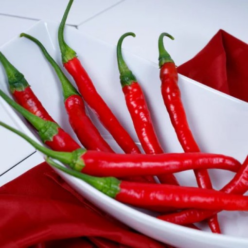 85 days. Capsicum annuum. Open Pollinated. Rajah Peppers. The plant produces heavy yields of 5" long by ½” wide Cayenne peppers. This pepper has superior quality, is medium hot, and turns from medium dark green to bright red when it matures. The plant has green stems, green leaves, and white flowers. The plant has a strong root system and good foliage cover to help protect fruits against sunscald. It is one of the best Cayenne peppers for seasoning pickles, chili, and salsa. Heat Tolerant. Drought Tolerant. An excellent choice for home gardens, farmer’s markets, market growers, open production, and commercial production. A variety from the USA. Scoville Heat Units: 6,000.